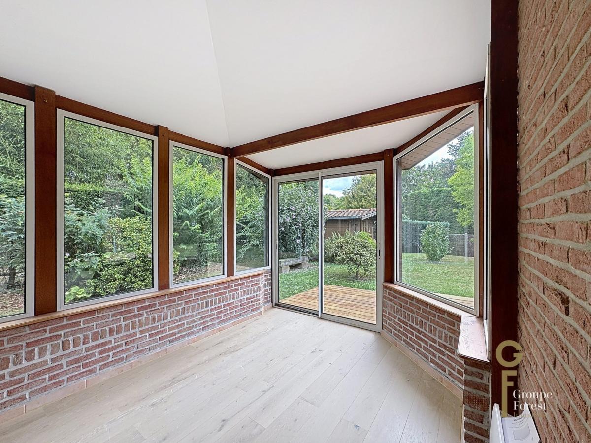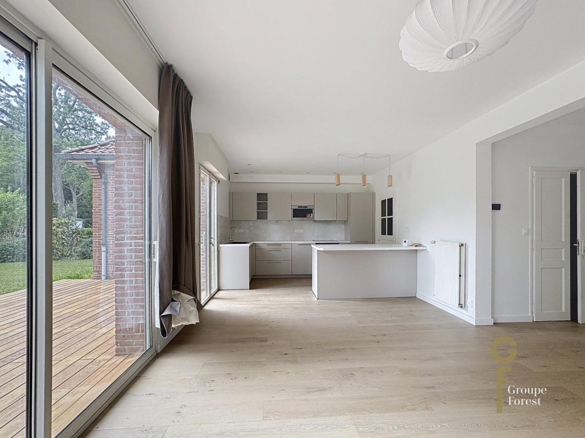 Entièrement rénovée, avec des matériaux de qualité, elle se compose d'une belle entrée, un séjour en L avec cuisine ouverte et véranda, vue sur le magnifique jardin arboré, sans vis à vis.