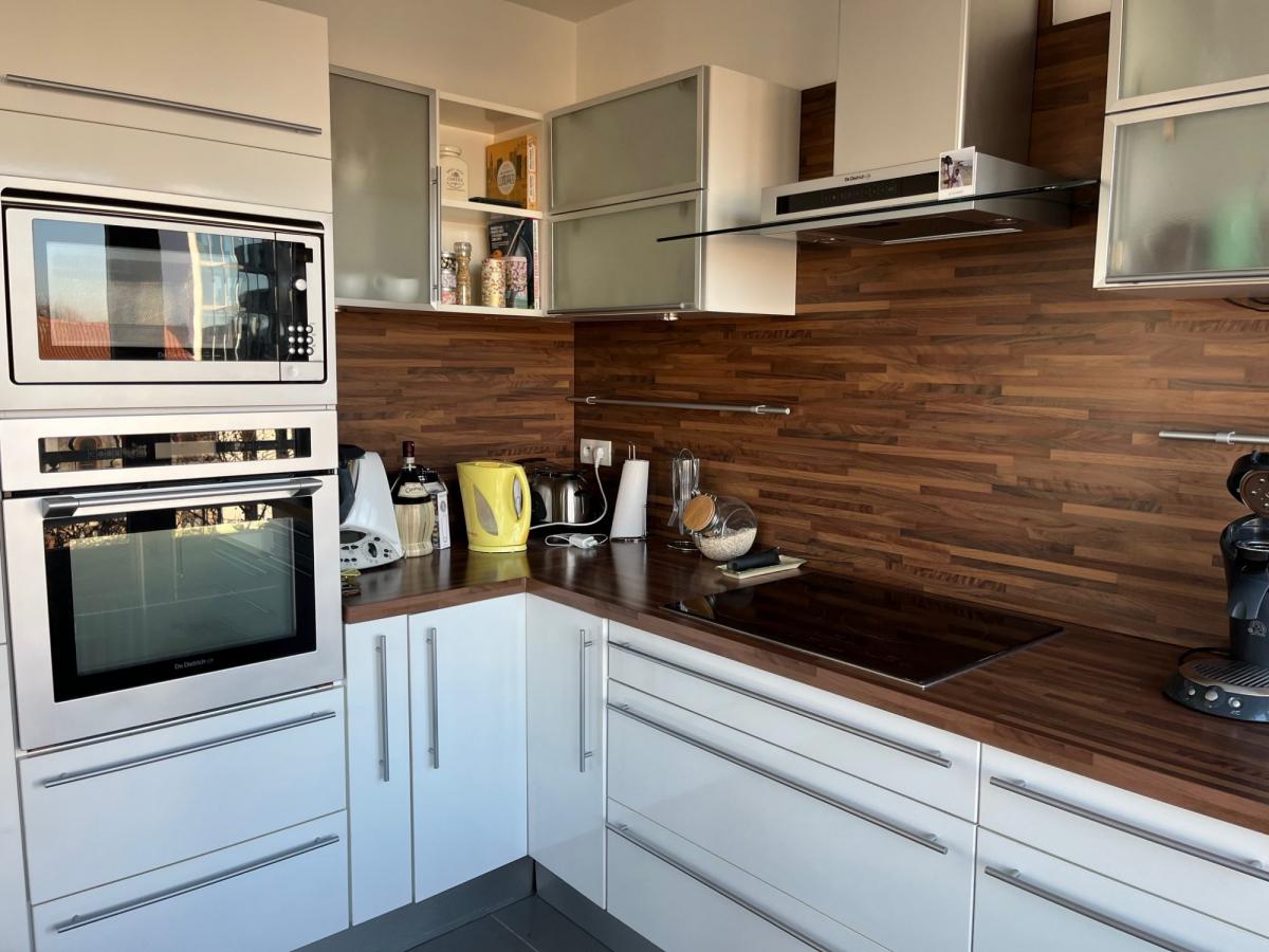 Belle entrée distribuant l espace séjour lumineux avec balcon et sa cuisine équipée separée par une verriere.