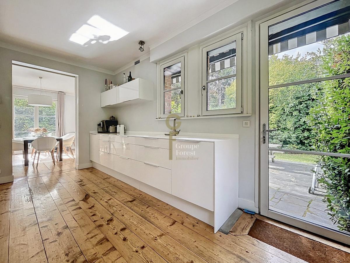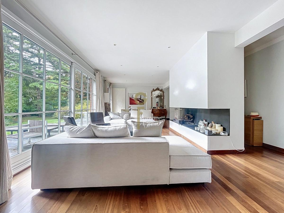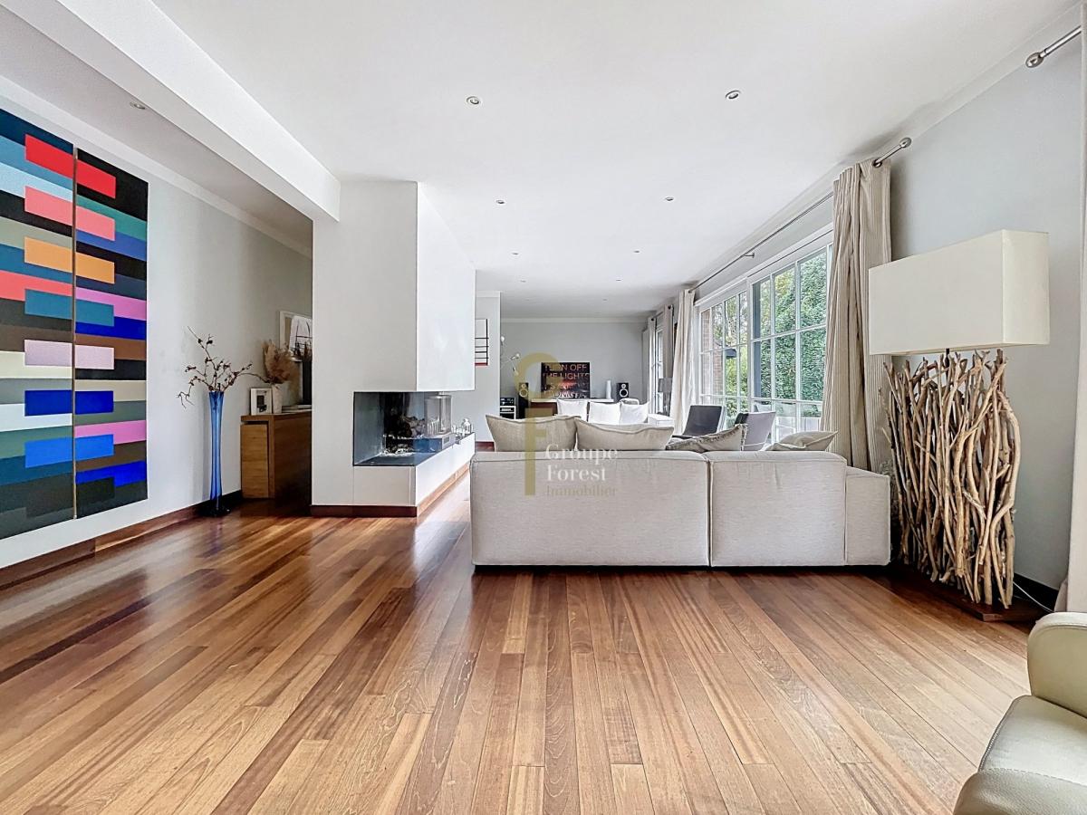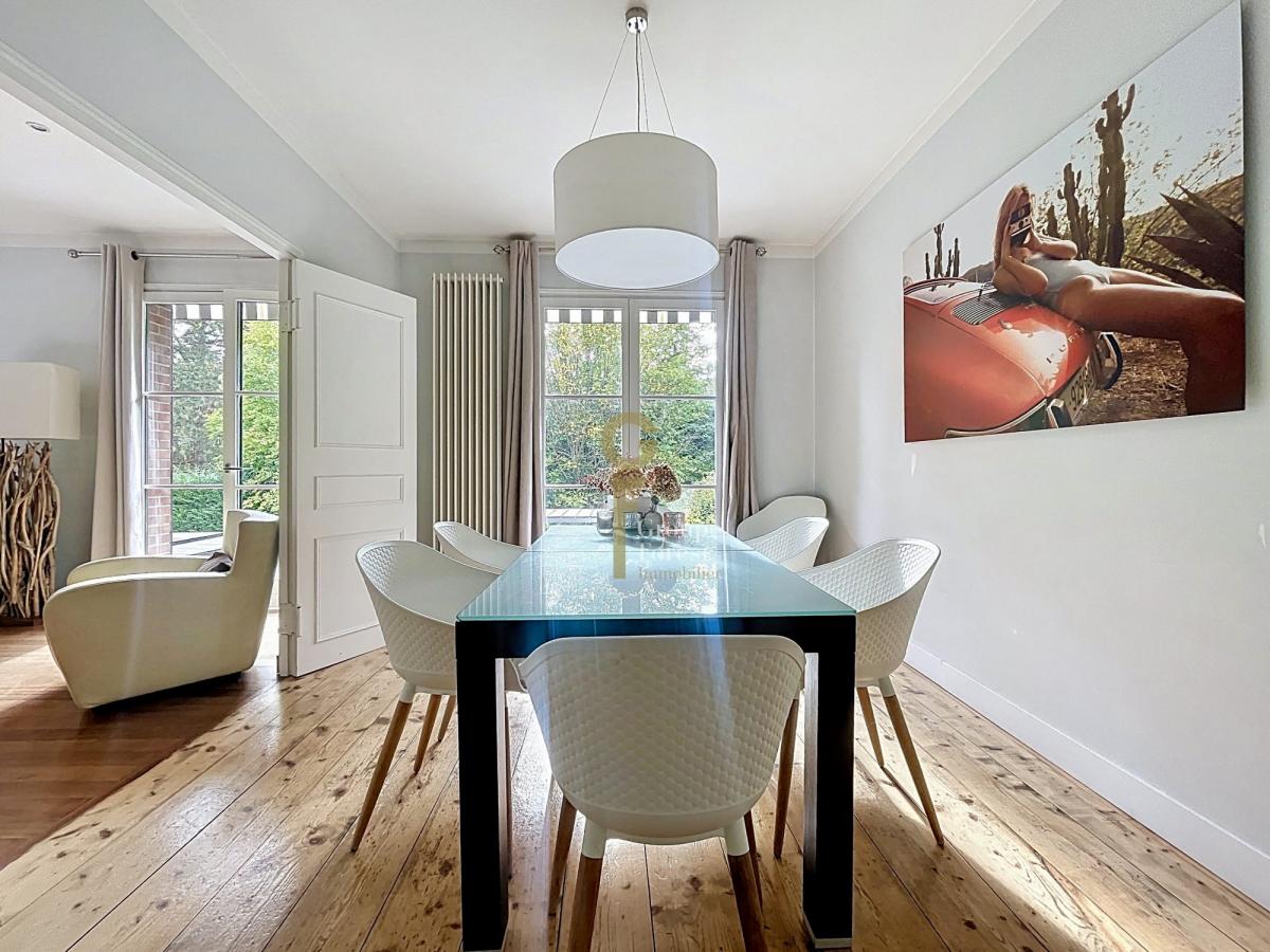 Dès l’entrée, vous serez séduit par une vaste pièce de vie de 73 m², baignée de lumière grâce à ses grandes ouvertures sur le jardin.Le parquet massif et la cheminée à foyer ouvert créent une atmosphère chaleureuse, parfaite pour les moments en famille ou entre amis.La salle à manger s’ouvre sur une cuisine équipée, à la fois fonctionnelle et élégante.