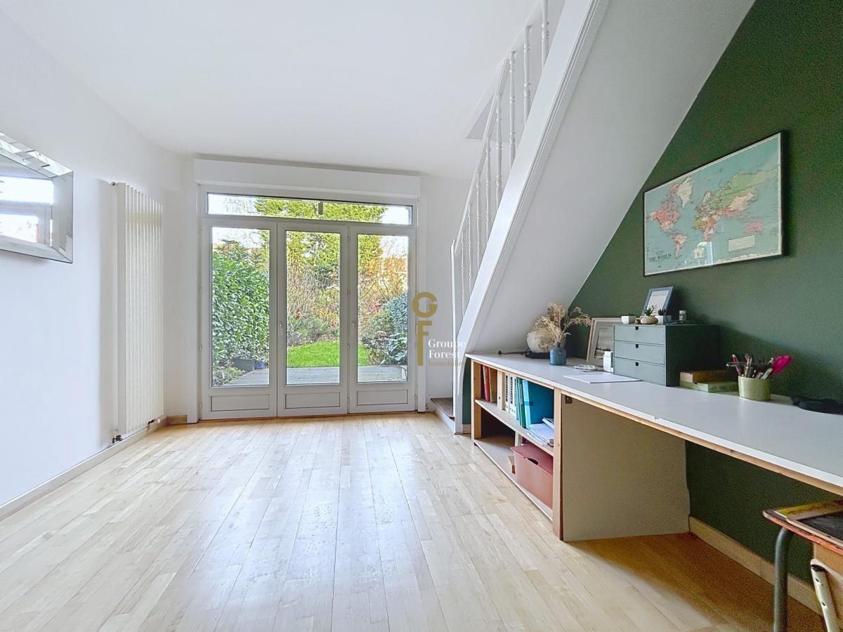 Le rez-de chaussée propose une entrée de caractère avec vestiaire, un garage de 15 m² traversant avec un espace chaufferie et buanderie, un bureau ou une chambre de 13 m² avec une grande baie vitrée sur le jardin.