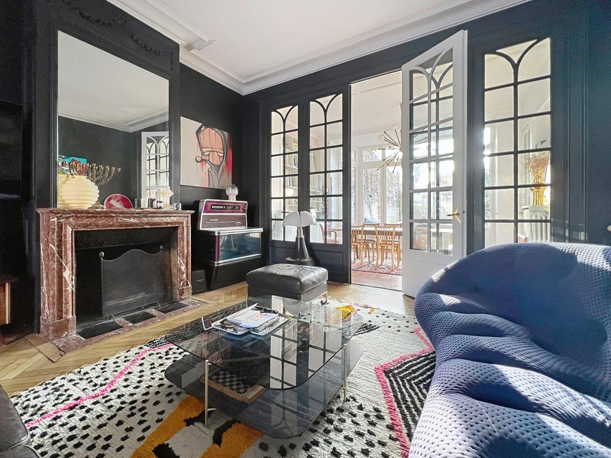 Elle offre un hall d'entrée, un bureau front à rue, un magnifique double séjour avec cheminée feu de bois, une salle à manger avec bow-window avec accès au jardin exposé SUD OUEST sans vis à vis d'environ 95 m². Cuisine équipée neuve avec espace déjeuner.