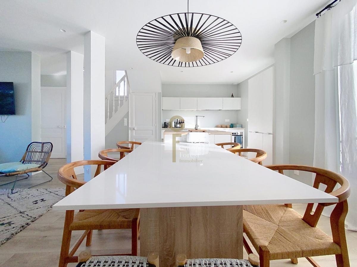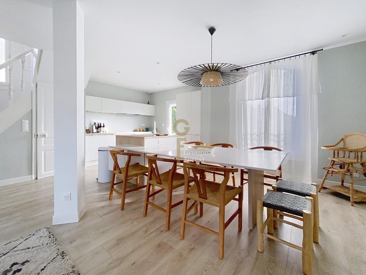 Un escalier permet l'accès au hall d'entrée qui distribue une belle pièce de vie très lumineuse, avec un salon séjour, une salle à manger et une cuisine entièrement équipée ouverte, avec un accès extérieur donnant sur la terrasse bois et le jardin exposition Sud Est.