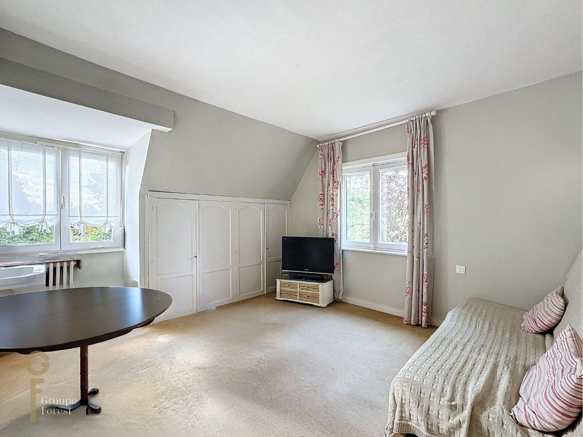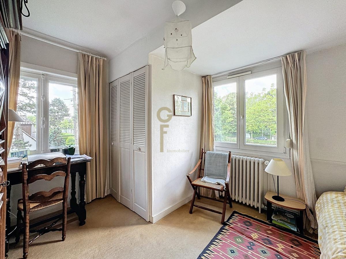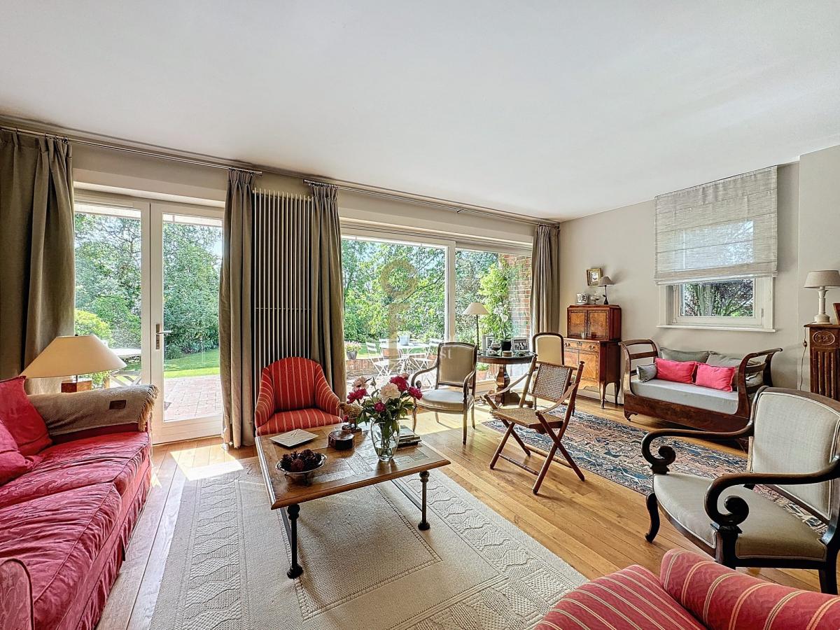 Séjour parqueté chêne avec jolie cheminée donnant sur beau jardin arboré sud est.