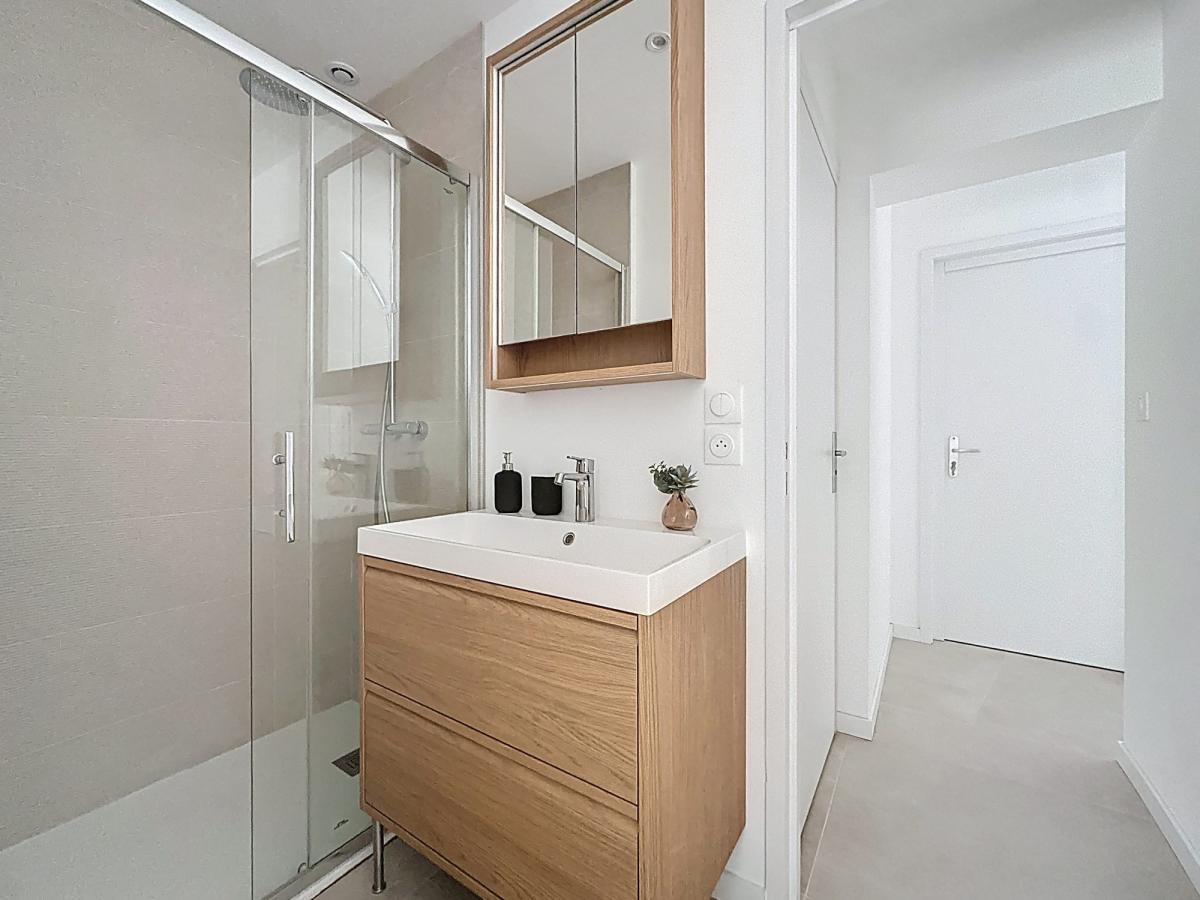 Entrée, pièce à vivre de 45 m² avec cuisine équipée ouverte, coin parents avec salle de douche.