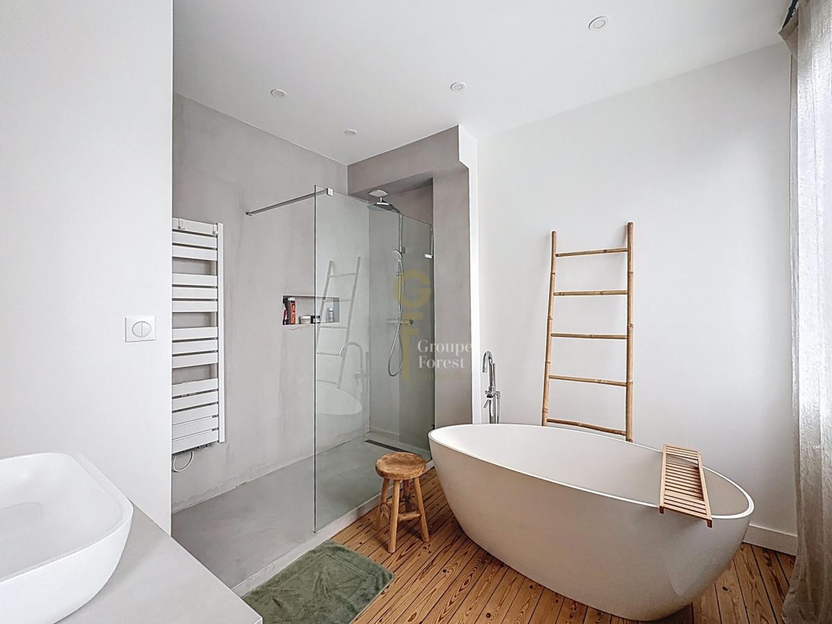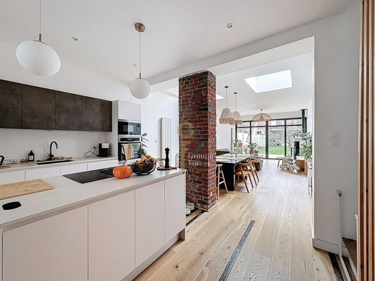 Au rez-de-chaussée, une entrée indépendante mène à un vaste espace de vie d’environ 45 m², baigné de lumière et pensé pour la convivialité. La cuisine de 16 m², entièrement équipée avec de l’électroménager de qualité, se distingue par son plan de travail en Dekton. Une grande baie vitrée toute hauteur s’ouvre sur le jardin et la terrasse, créant une transition fluide entre l’intérieur et l’extérieur. L’extension réalisée lors des travaux apporte un volume supplémentaire très appréciable et accueille un espace de vie confortable, sublimé par la présence d’un poêle.