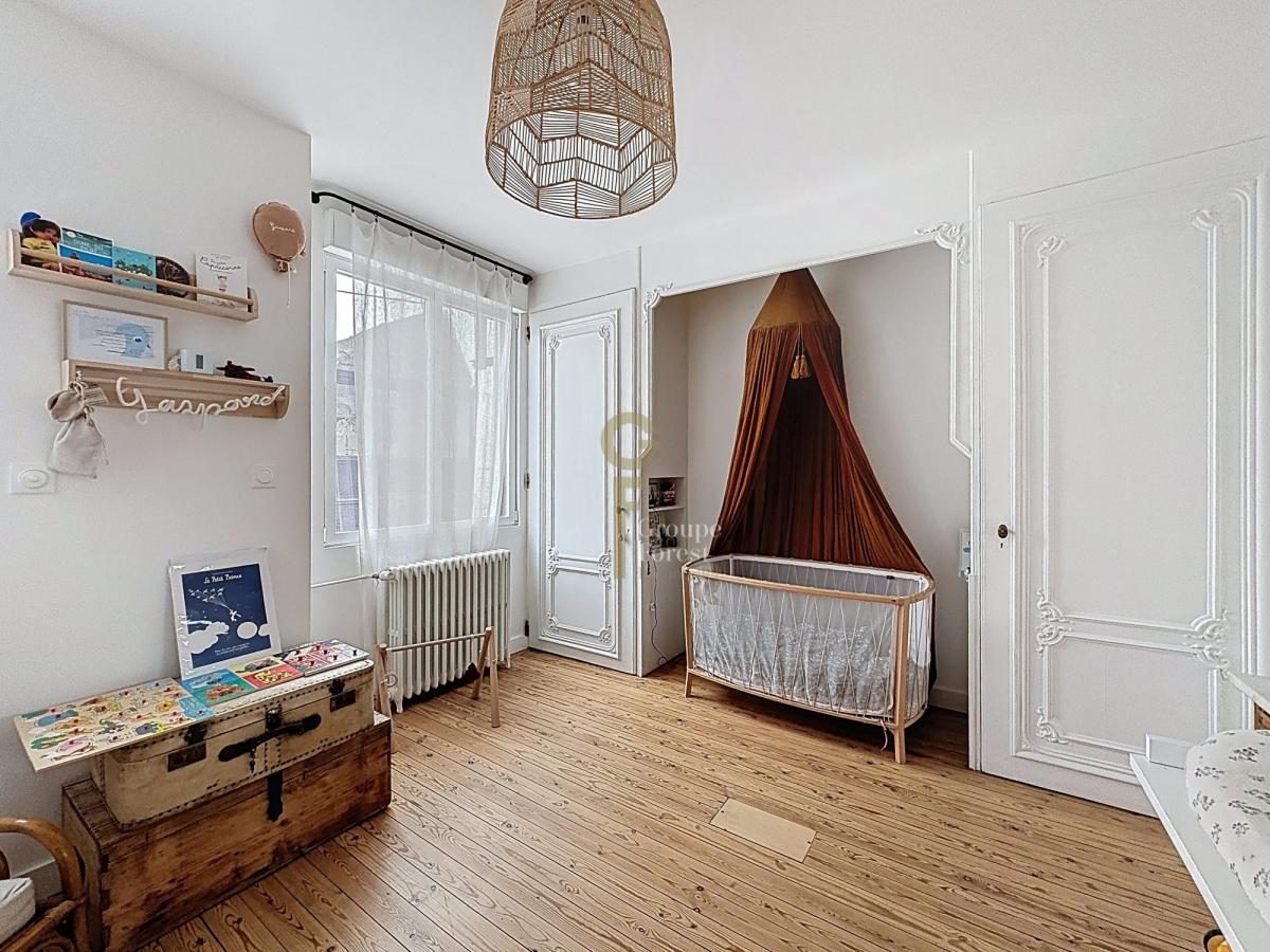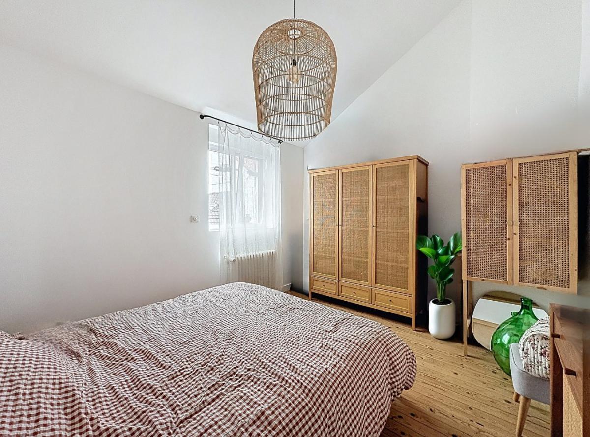 Au deuxième étage, deux chambres de 14 m² et 12 m² profitent d’une belle hauteur cathédrale qui accentue la sensation d’espace et de caractère. Des rangements intégrés ont été aménagés avec soin dans l’ensemble de la maison afin d’optimiser chaque niveau.