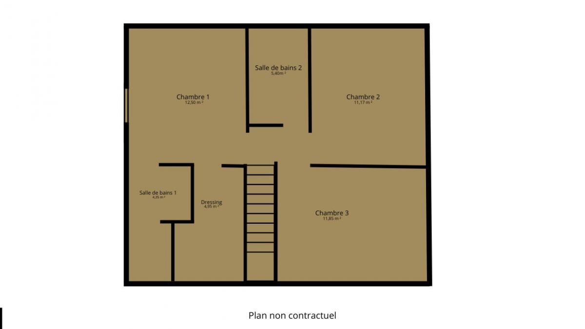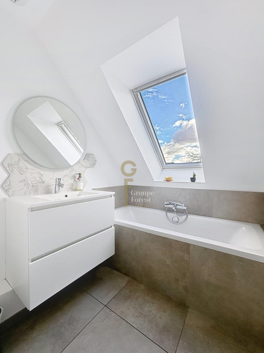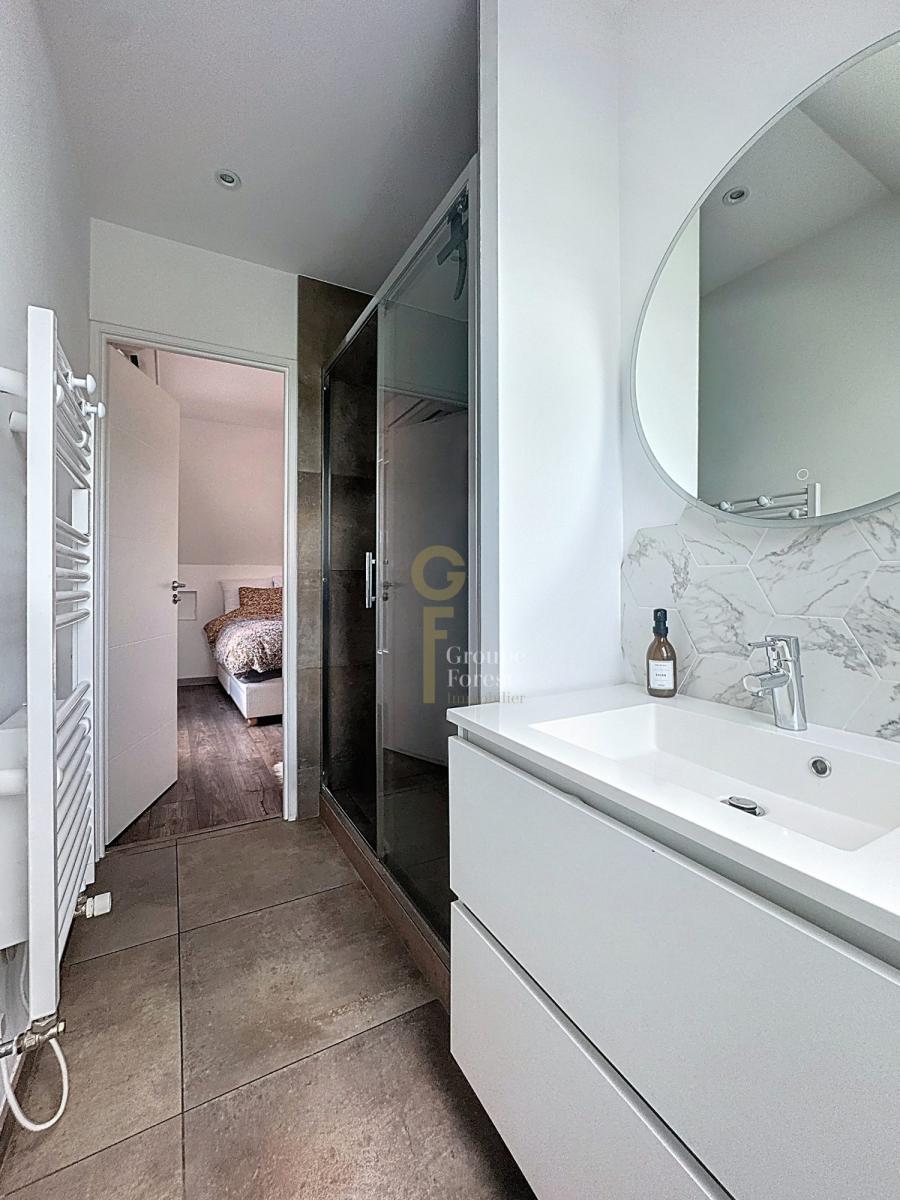 À l’étage, le palier dessert une salle de bains, deux chambres confortables avec dressing ainsi qu’une suite parentale de 17m² composée d’un dressing et d’une salle de douche privative.