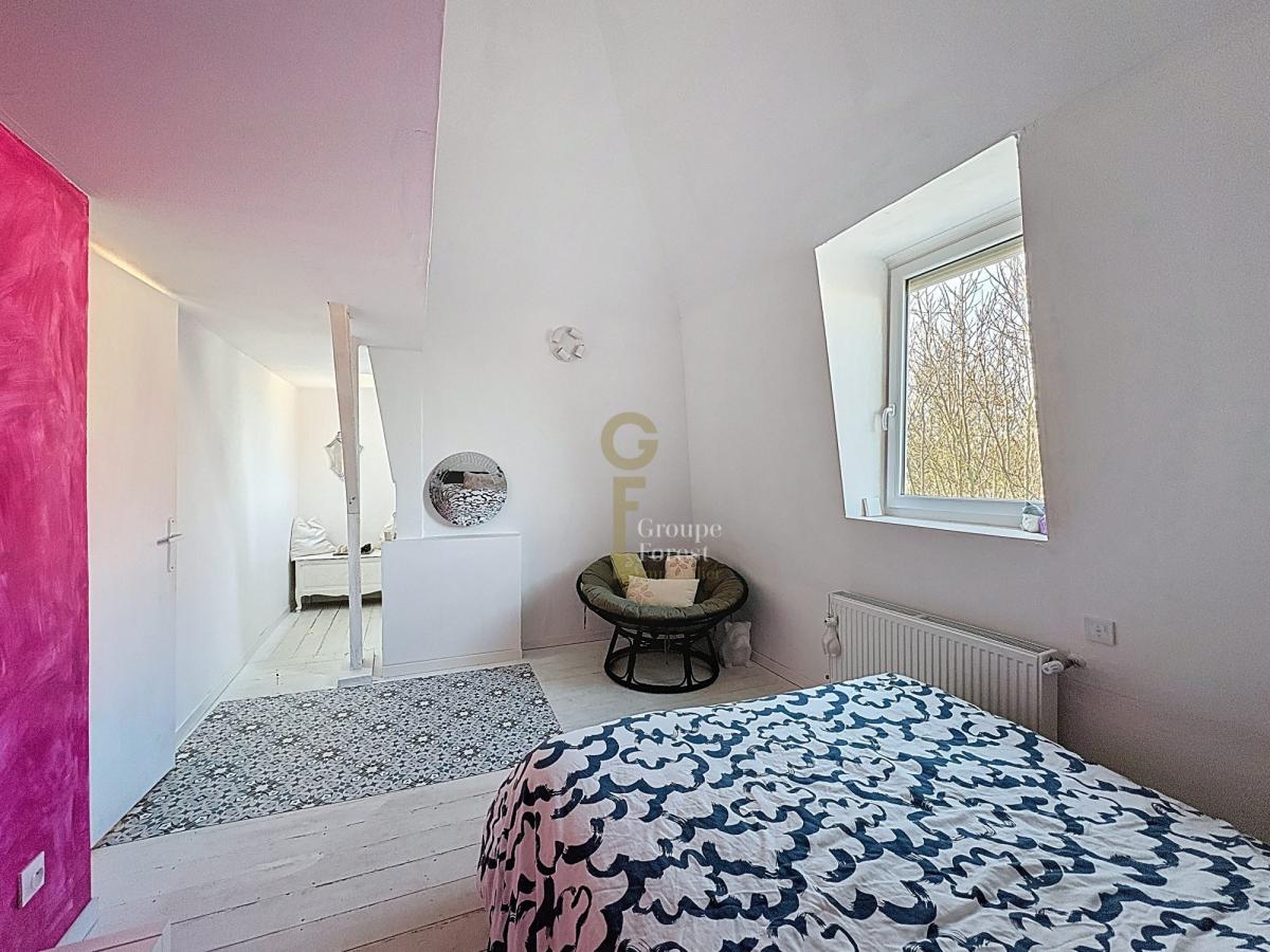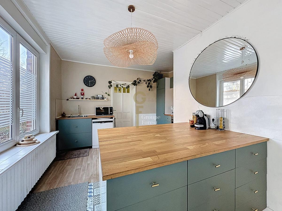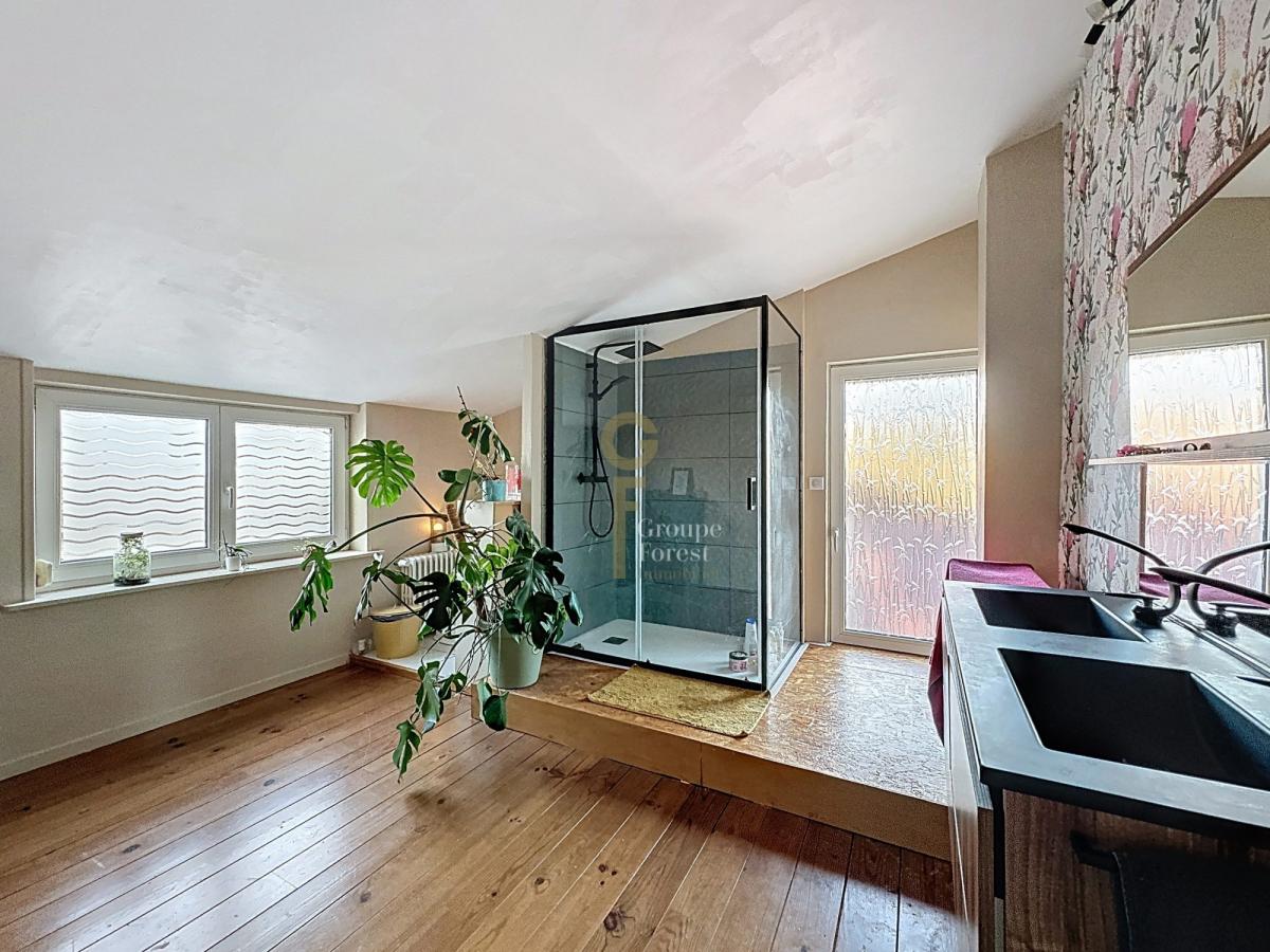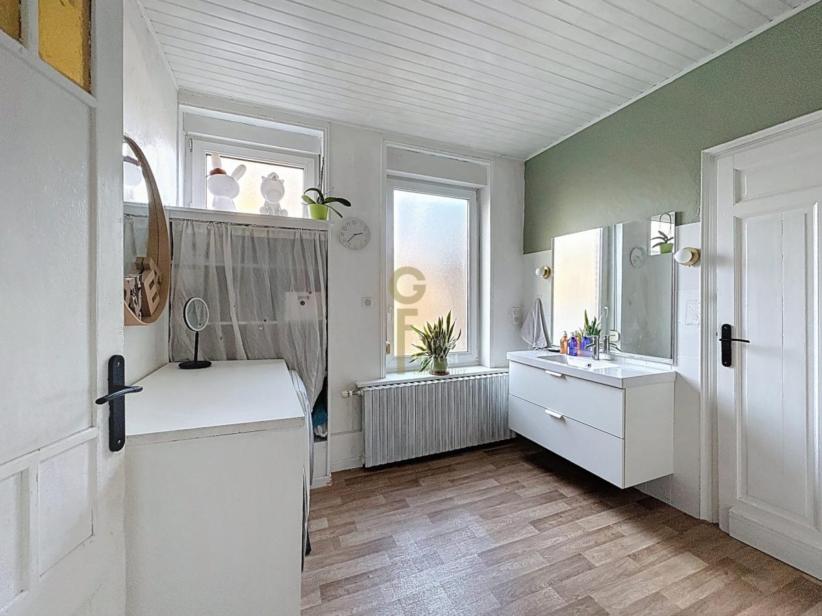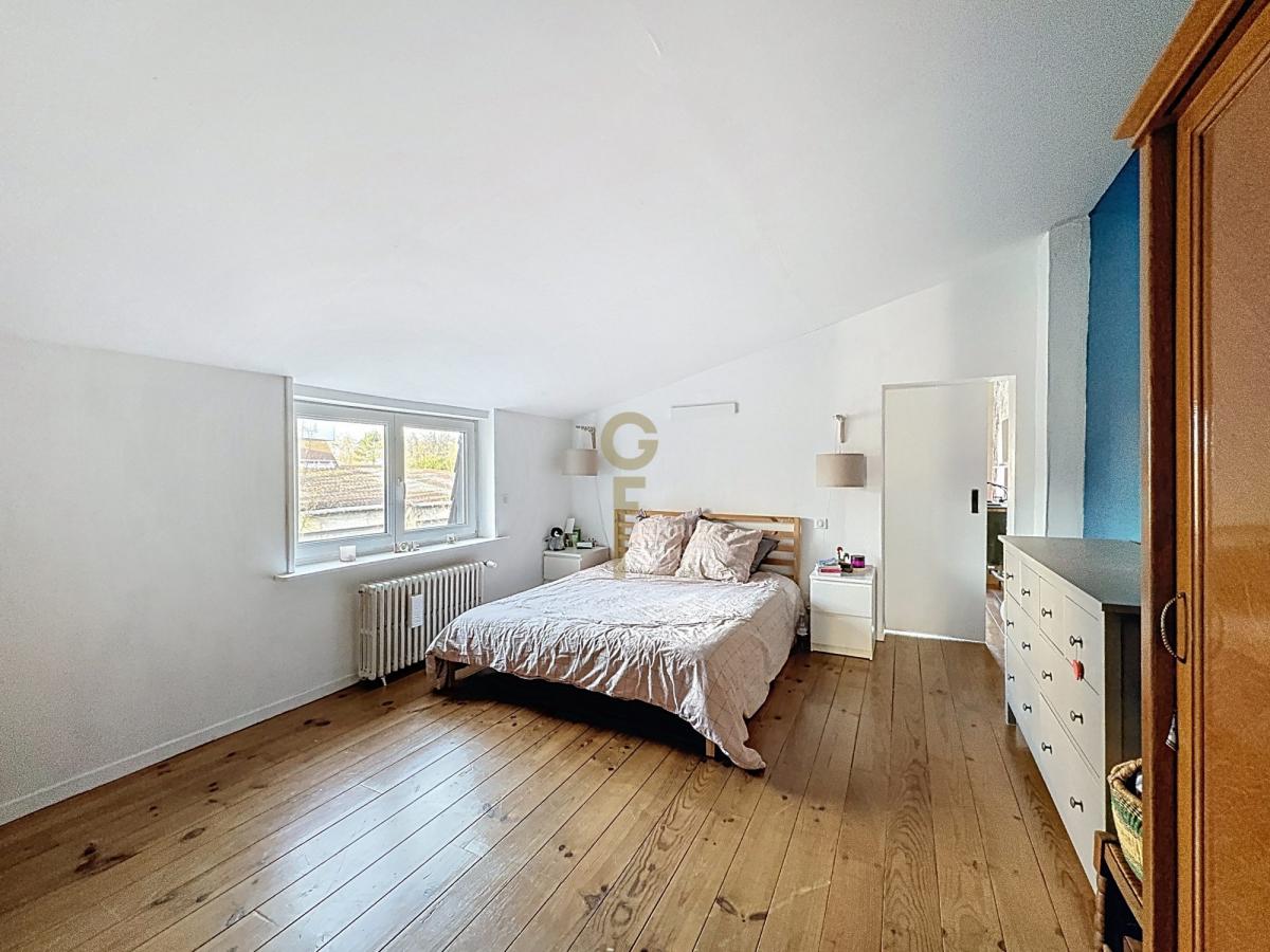 Dès l’entrée, la maison révèle une belle hauteur sous plafond et de superbes carreaux de ciment d’époque qui soulignent le charme de l’ancien. L’entrée se fait par une cuisine de 14 m² qui se prolonge sur un salon lumineux de 40 m², équipé d’un insert et ouvert sur une agréable véranda donnant sur le jardin. Le rez-de-chaussée accueille également un bureau et une salle de bains spacieuse.