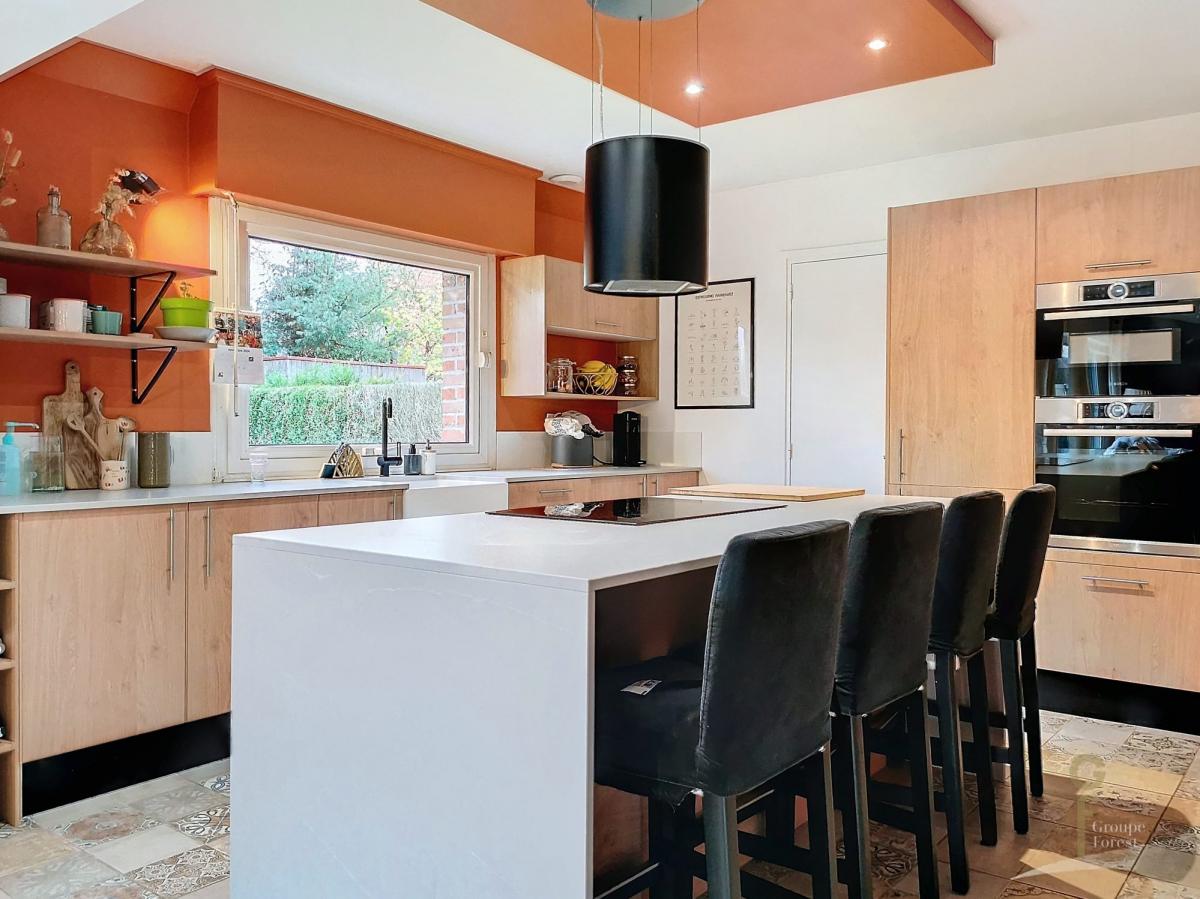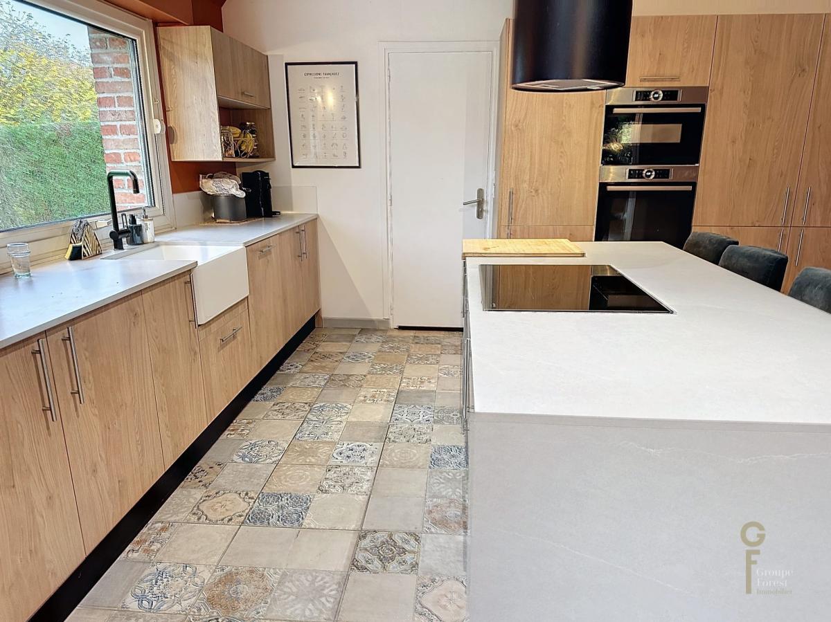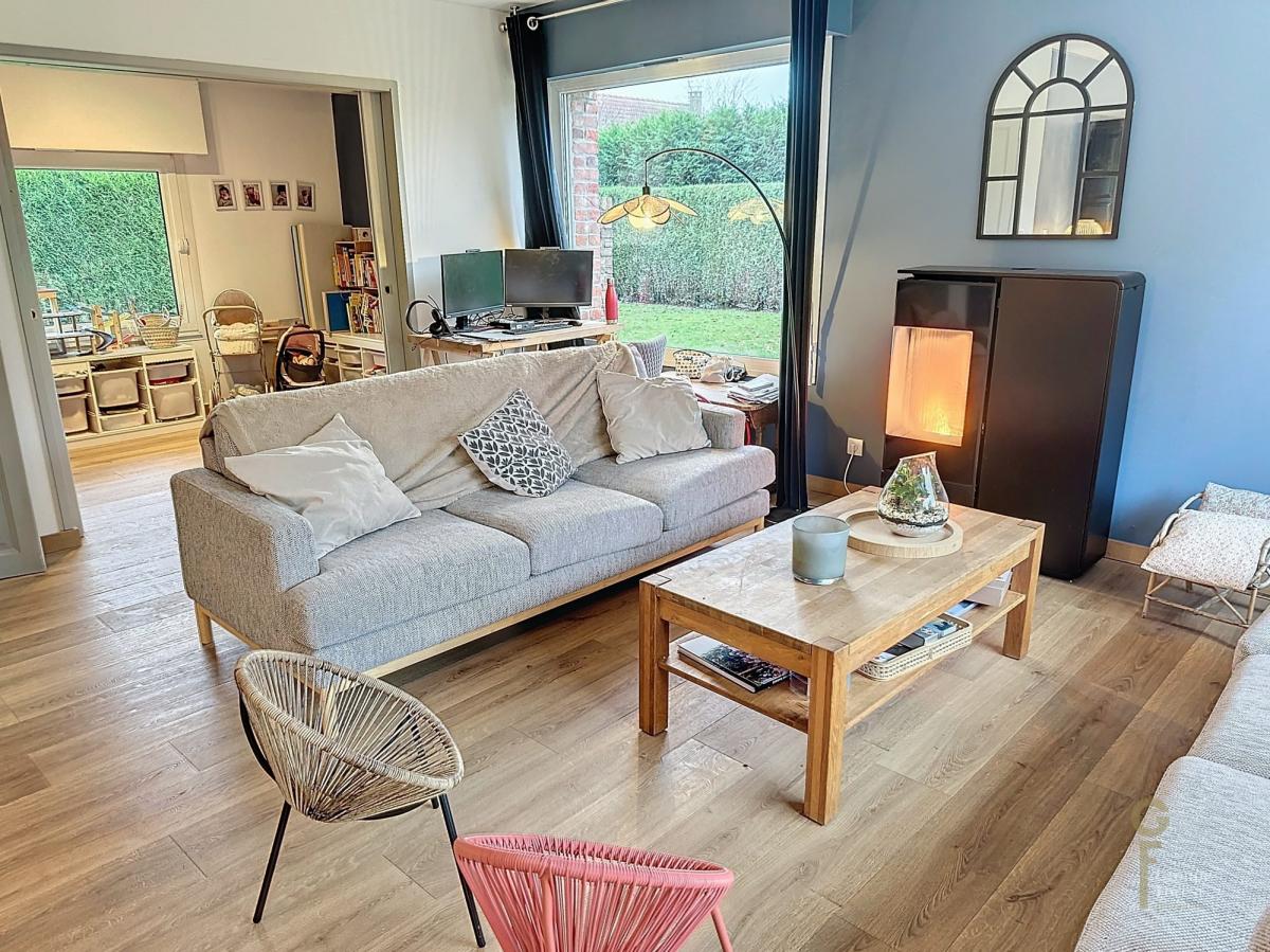 ENTREE AVEC RANGEMENT, SEJOUR PARQUETTE AVEC POELE A PELLETS, GRANDE CUISINE OUVERTE RECENTE AVEC ILOT CENTRAL.